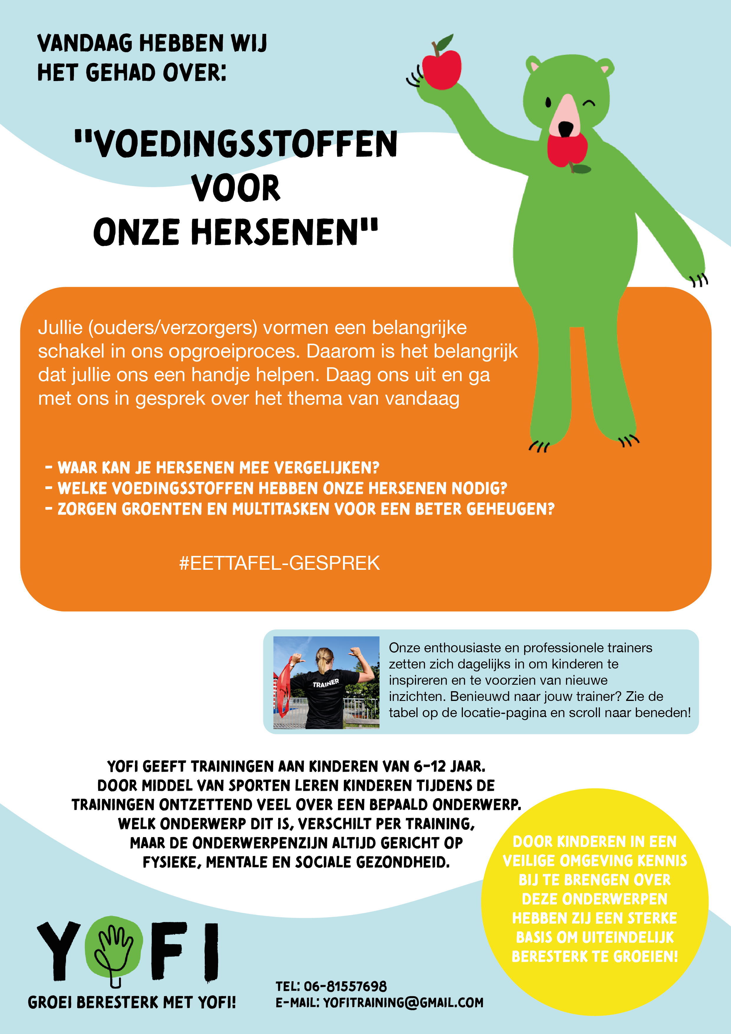 Belangrijk was dat de storytelling zou overbrengen dat YOFI staat voor het inspireren en bewustmaken van kinderen over fysieke, mentale en sociale gezondheid. De identiteit van YOFI moest vertaald worden in verschillende uitingen. Deze identiteit is gericht op dat het kind aan de hand van stabiliteit, goede voeding en kennis sterke wortels kan ontwikkelen en gezonder en gelukkiger kan groeien. De kernwaarden die hierbij belangrijk zijn, zijn: vriendelijk, inspirerend, laagdrempelig, veilige omgeving voor kinderen, speelsheid, sportief en gezondheid. De wens van de opdrachtgever was dat de storytelling vertaald wordt in de gehele organisatie en uitingen en dat er meer interactie zal zijn met de doelgroep.